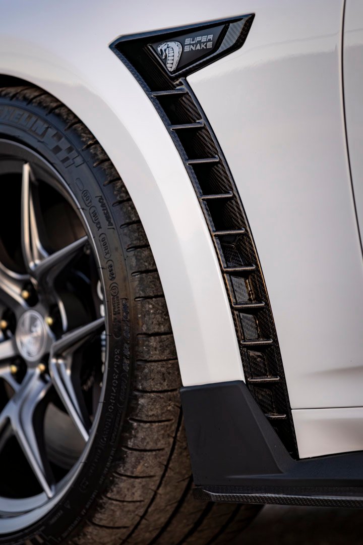 Con ello presenta un diseño más agresivo que el Super Snake “normal” ya que presenta nuevas mejoras las cuales están destinadas a pista sin perder el toque elegante de andar por la calle, para ello esta serpiente “mudo de piel” que ahora la hace ver más corpulenta que su versión normal ya que en este bólido presenta cambios exteriores que lo distingue de su hermano Super Snake, los cambios que en el exterior se muestran a simple vista son en los paneles traseros siendo de metal que recibieron un tratamiento para extenderse hacia afuera notándose por el paso de rueda por ambos lados del vehículo haciéndolo más ancho y adelante para completar esta anchura a modo de cuerpo de carrocería son de fibra de carbono, dándole ese aspecto intimidador y firma inconfundible de Shelby, a esto hay que anexar otros componentes que completan este diseño los cuales son de fibra de carbono como las ventilaciones del capo, splitter delantero (o divisor), estribos laterales, los alerones traseros como el de cola de pato así como el alerón tipo pedestal y el difusor trasero de fibra de carbono están puesto de manera estratégica para reducir el peso al mismo tiempo que mejora la aerodinámica activa y dominio visual.