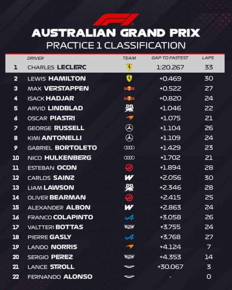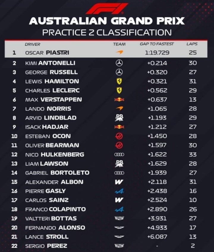 Luego de apenas dos meses por fin regresa la máxima categoría con nuevo reglamento, nuevas normativas y sobre todo nuevos vehículos con modos totalmente distintos a los anteriores, para ello esta nueva campaña se inauguraría con la primera ronda en Australia, donde los espectadores y televidentes ya estaban a la espera de tan ansiado comienzo dando paso con el primer bloque de actividades las cuales serían las prácticas libres, para ello la primera sesión ya estaba iniciada pero no sabíamos que nos depararía, pues el piloto local Piastri al anexarse al trazado apenas avanzados unos metros reportaba que no tenía potencia en su monoplaza marcando así la primera bandera amarilla la cual después se convirtió en un VSC (Virtual Safety Car – Auto de Seguridad Virtual) ya que quedó varado a la salida de la calle de boxes, pero atrás de el otro piloto que también presento detalles fue el joven piloto Lindblad quien no alcanzo a salir a pista quedando varado dentro de la calle de boxes apenas para salir, por lo que tuvo que ser llevado al garaje cuanto antes para poder arreglar la falla así como Piastri, por lo que el VSC se extendió un poco hasta que se retiraran por completo los autos y ya no hubiera peligro. Luego de que el VSC fuese finalizado las cosas volvieron a la normalidad reanudando de nuevo la sesión, pero a los minutos se hacía un comunicado de parte de Honda que mencionaba que Alonso no tendría participación en la primera práctica por problemas en la unidad de potencia y Stroll por su parte solo rodo tres vueltas haciendo que tampoco rodara, así pues avanzaba la sesión donde se presentaba algunos casos de tráfico con bloqueos y salidas las cuales fueron de Franco y Hadjar quien el piloto francés no mide la distancia y eso hace que frene tarde y por ende se valla por fuera de la curva 1, minutos más tarde se registraría otra bandera amarilla ahora generada por Albon el cual su bólido presentaba perdida de presión en el sistema hidráulico por lo que abandono esta primera sesión y otro piloto que también estaba pasando por alto es Norris, quien en esta sesión también abandono ya que su auto presento problemas pero no mencionaron de que, por lo que no continuo haciendo más vueltas. Más adelante ya en los últimos minutos de la sesión se registraría una bandera amarilla efímera de parte de Pérez quien en la curva numero 7 perdía el auto a lo que hizo un deslizamiento lateral, esto a causa del freno del motor por lo que no corrió peligro llevando un susto solamente. Además de esto también pudimos preciar que teníamos una batalla por quien ponía los mejores tiempos y veíamos a Leclerc, Russell, Hamilton, Antonelli, Piastri, Hadjar, Verstappen los cuales con cada vuelta mejoraban su tiempo y así se colocaban dentro de los tres mejores, al final solo tres de ellos plasmarían los mejores tiempos de la primera sesión siendo Leclerc, Hamilton y Verstappen quienes eran los tres mejores tiempos, para ello Piastri y Lindblad pudieron salir a pista después de arreglar los detalles que presentaron al inicio de la actividad colocándose dentro del top 10 así como el dúo de Audi.