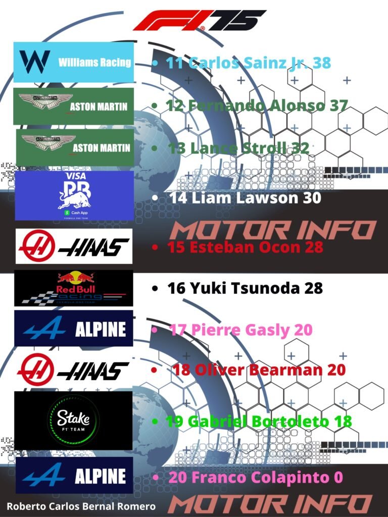 Racing Bulls esta vez no consiguió nada de puntos salvo resultados, en carrera sprint Lawson un P9 y Hadjar un P12 y en la carrera del día domingo Lawson un P11 y Hadjar un P16 no tan agradable, además en clasificación del día sábado colisiono contra el muro generando bandera roja saliendo muy molesto del auto, mientras que Alpine tampoco obtienen puntos solo un P10 Gasly y Colapinto un P14 en carrera sprint y en carrera normal Colapinto un P17 esto después de adelantar a su compañero luego de hacer caso omiso a las reglas del equipo porque si no Bortoleto haría doble adelantamiento y Franco iba más rápido que su compañero Gasly que termino en P19, sino ambos terminarían más atrás en la tabla.