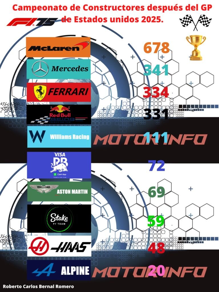 Para McLaren en este fin de semana las cosas pintaron de manera regular, si bien comenzaron dominando la única sesión libre del día viernes y colocarse detrás de Max en P2 Norris y Piastri en P3 en la clasificación sprint que los llevaría a la carrera, pues en el evento del día sábado que fue la carrera de dicho formato para este fin de semana las cosas tuvieron un giro inesperado, si bien ambos salían de buenos lugares y así harían que les costara menos puntos recortados a los dos por parte Verstappen salió más beneficiado y la naranja mecánica perjudicada, ya que al largar y llegar a la curva 1 los pilotos al doblar lo tenían que hacer de manera cerrada el cual este caso paso por Norris después de ser adelantado por Piastri, que al cerrarse para doblar fue impactado por Hülkenberg el cual llevaba una trayectoria interna que al llegar a dicha curva colisiona con Norris para que después colisionara con su compañero desencadenando una reacción en cadena y así quedaran fueran ambos pilotos como Alonso y dañando sus autos como Stroll, Colapinto y Hülkenberg. Pero después de la carrera sprint sus autos estuvieron listos para continuar con las actividades la cual seguía la clasificación para la carrera del día domingo donde Norris se colocó en P2 y Piastri en P6 el cual en carrera siendo este el resultado que logro, y para la carrera el piloto australiano solo ascendió una plaza lo cual fue un resultado decepcionante para el después de mencionarlo pero aun lo mantiene en juego y liderando el campeonato ya que esto le sirve para que no se frustre aunque sea menos y así continúe sumando puntos ya que Verstappen ha olido la sangre como un tiburón en agua ya que ha estado recortándole puntos y con ello sienta presión las cual algunos mencionan pero si no se equivoca no sabrá tener éxito de la derrota y así no cometer errores, por lo que estas rondas finales serán interesantes.
