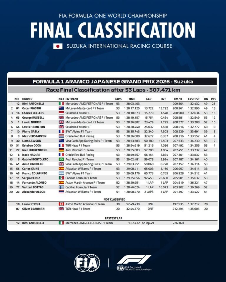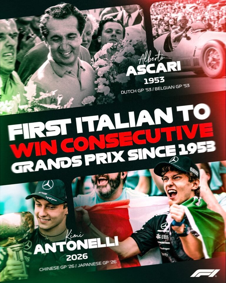 La tercera ronda fue distinta respecto a las dos anteriores, pues aquí Kimi Antonelli se alzó con la victoria quien al momento de largar lo hizo de manera tardía ya que arranco un poco después junto a su compañero Russell, pero con el curso de la carrera en marcha el joven piloto se pudo recuperar y para ello fue el líder de carrera, lo cual le permitió cruzar la meta en P1 y con ello obtener la victoria de manera consecutiva, a lo que deja de nuevo el piloto italiano sobre su victoria en Japón algunos datos los cuales ya está escribiendo en las páginas del libro de la vida, para ello el primer dato seria la pole la cual gano de manera consecutiva y con esto consigue la “pole position” número 50 lograda por un piloto italiano en la F1, esto contando desde Giuseppe Farina, Alberto Ascari, Riccardo Patrese, Giancarlo Fisichella y Jarno Trulli hasta Kimi Antonelli, y que además deriva de ello un lapso de tiempo, ya que pasaron 70 años para que otro piloto italiano consiguiera victorias consecutivas haciéndolo primero Giuseppe Farina con los GP de Holanda y GP de Belgica en el año de 1953 y Kimi Antonelli en nuestros presentes días en el GP de China y GP de Japón por lo que esta cifra podría cambiar ya que hay un piloto italiano en activo en la F1, el siguiente dato es que con esta carrera asegura su segunda victoria como ya lo mencionamos que se alzó con ella pero a la vez que se convierte en el adolescente que gana múltiples Grand Prix en la F1, con la victoria deriva otros datos ya que ahora por primera vez es líder del Campeonato de Pilotos en su carrera y siendo el joven que lidera el Campeonato de Pilotos con tan solo 19 años y 216 días, por lo que toda Italia está muy emocionada en estos momentos teniendo un representante que los llena de orgullo. Y las razones por la cual Russell no fue tan sólido en el fin de semana en Japón vía Motorsport son las siguientes: