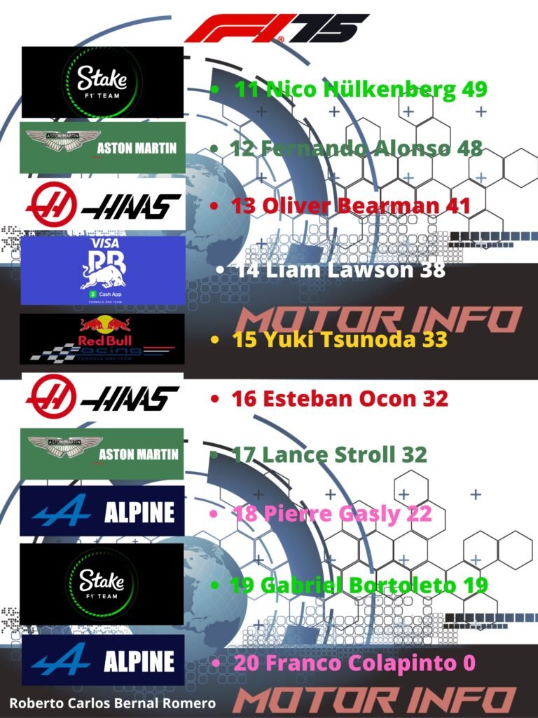 Después viene Russell en P6 que también sumo en carrera sprint como en la carrera principal subiendo al podio con un P2, en P7 Alonso también tuvo un fin de semana bueno como su compatriota que ambos consiguieron puntos en esta fecha sin ir se con los bolsillos vacíos, Leclerc que con esta últimas carreras el equipo no le ha ido bien y rescato puntos solo en una carrera al terminar en P8 los cuales son mínimos pero se mantienen sumando, siendo la del día domingo, P9 para Lawson y P10 para Tsunoda que también lograron sumar una mínima cantidad de puntos pero el piloto japonés a diferencia del piloto neozelandés consiguió un poco más terminando en P5 en la carrera sprint.